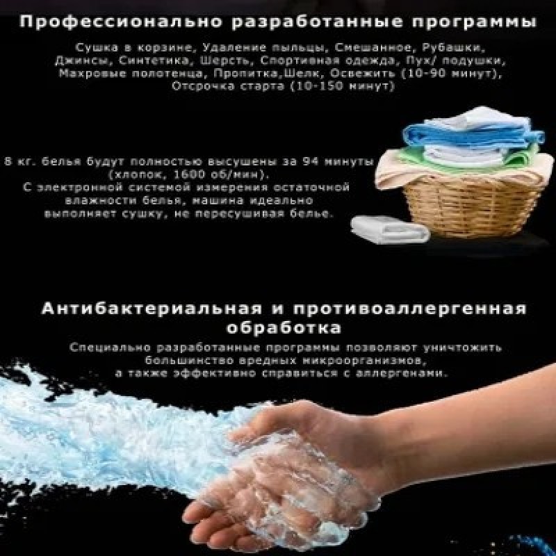 Сушильная машина Kuppersbusch T 40.0 R Ever RoseПрограммы/дополнительные программы: Автоматические программы для хлопка и немнущихся тканейОт степени сушки «под утюг» до «экстра-сухое»Специальные программыСушка в корзине, Удаление пыльцы, Смешанное, и другие программы: Рубашки, Джинсы, Синтетика, Шерсть, Спортивная одежда, Пух/ подушки, Махровые полотенца, Пропитка, Шелк, Освежить (10-90 минут), Отсрочка старта (10-150 минут)ИзбранноеСохраняет до 6 Ваших любимых программДополнительные функцииАнтибактериальная обработка, Бережный уход +, Сушка +, Отсрочка старта, Экспресс8 кг белья будут полностью высушены за 96 минут («в шкаф»)Преимущества:Большой цветной дисплей 4,3’’Корзина для сушки деликатных тканей и спортивной обувиСушильная машина конденсационного типа с технологией Heat Pump и система самоочистки Autoclean для эффективного использования электроэнергии на протяжении всего срока службы машиныВысший уровень эффективности конденсацииПрограмма антибактериальной обработки для гигиенической сушки бельяПрограмма «Удаление пыльцы» позволяет очистить ткани от пыльцыПревосходная шумоизоляция, макс. 61 дБ(А)Светодиодная подсветка барабанаЗащита от складокЭлектронная система измерения остаточной влажности бельяИндикация хода программы и времени до окончания программы, отложенный запуск – до 7 днейРегулируемый по интенсивности акустический сигнал окончания программыУгол открывания люка – 180°, диаметр люка – 36/31 смВозможность перенавески люка (правая/левая)Защита от детейКонтроль температурыСпециальные программыСушка в корзинеВлажные вещи из шерсти желательно как можно меньше подвергать воздействию, так как они имеют тенденцию сморщиваться и садиться. Спортивная обувь может повредить барабан из-за своего веса. Использование корзины позволяет выполнять деликатную сушку без перемещения отдельных стойких к машинной стирке предметов: шерстяные изделия, спортивную обувь из синтетических материалов или искусственной кожи, шапки, велосипедные шлемы, мягкие игрушки, игрушки и пр.СмешанноеЭта программа оптимально подходит для сушки смешанной партии белья из хлопка и синтетикиДругие программыИспользуйте эти программы для оптимальной сушки различных видов текстиля, например сорочек, блузок, джинсов, шерсти и пр.Дополнительные программыАнтибактериальная обработкаПри выборе этой программы увеличивается время дополнительной сушки, что позволяет уничтожать большинство бактерийБережный уход плюсДля бережной сушки деликатных вещей. Температура сушки пониженаОтсрочка стартаС помощью данной программы запуск программы можно отложить на более позднее время в соответствии со своим привычным образом жизни (например, для использования льготного ночного тарифа на электроэнергию)Сушка +При выборе этой программы временно увеличивается степень сушки — на время работы выбранной программыВремяПри открытии программы с управлением по времени отображается минимальное время выполнения программыЭкспрессДля быстрой сушки небольшой партии или отдельных изделий из хлопка, синтетики или смешанной тканиХарактеристики:Конденсационная сушильная машина с технологией Heat PumpЗагрузка 1-8 кгСтационарная установка/установка в колоннуНавеска люка левая/праваяВозможность изменения навески люкаРазмеры прибора (Ш х В х Г): 595 х 850 х 640 ммСделано в Швейц