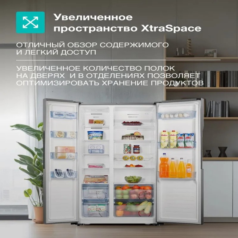 Практичные и просторные. Продуманная организация внутреннего пространства предлагает больше места для хранения, что избавляет вас от частых походов в магазин. Продукты легко размещаются на стеклянных полках, в больших ящиках и на дверных полочках. Это значит, что вы всегда будете видеть, что у вас есть в холодильнике, и выбрасывать меньше «неликвида».